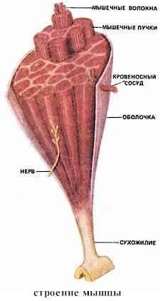 Скелетные мышцы состоят из пучков по перечнополосатых мышечных волокон. К каждой мышце подходят кровеносные сосуды и нервы. Мышцы покрыты соединительнотканной оболочкой и прикрепляются к кости при помощи сухожилий.