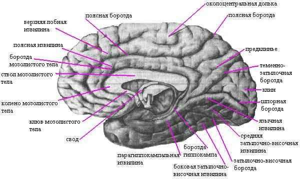 В теменной доле проходит постцентральная борозда, отделяющая постцентральную извилину, и внутритеменная, делящая остальную часть теменной доли на верхнюю и нижнюю теменные дольки. В нижней дольке выделяют надкраевую и угловую извилины. В височной доле две параллельно идущие борозды - верхняя и нижняя височные - делят ее на верхнюю, среднюю и нижнюю височные извилины. В области затылочной доли наблюдаются поперечные затылочные борозды и извилины. На медиальной поверхности хорошо видны борозда мозолистого тела и поясная, между которыми находится поясная извилина.