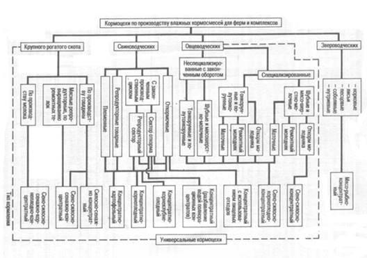 По технологии приготовления кормов и наличию технологических линий кормоцехи для приготовления влажных кормосмесей подразделяют на три основных типа: для приготовления кормосмесей из различных компонентов путем механического измельчения и смешивания; эти кормоцехи применяют в хозяйствах, располагающих доброкачественными кормами, не требующими специальной обработки; для приготовления кормовых смесей с применением тепловой обработки кормов; эти кормоцехи имеют технологические линии для запаривания, стерилизации кормов и смешивания их с концентратами, мелассой и другими добавками; для приготовления смесей с применением термохимической и биологической обработки кормов; в этих кормоцехах компоненты обрабатывают химическими веществами, подвергают дрожжеванию и ферментации. Состав оборудования кормоцехов зависит от типа кормления животных и суточного объема производства кормосмесей.