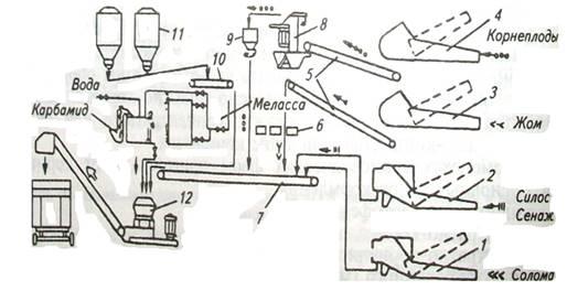 На фермах и комплексах крупного рогатого скота для подготовки влажных полнорационных смесей применяют кормоцехи с использованием соломы, прошедшей термохимическую обработку и без нее. Первый тип кормоцехов отличается более сложным схемно-конструктивным исполнением: в комплекте машин и оборудования имеются агрегаты или установки для термохимической обработки соломы, например смесители С-12-1, С-1-А, С-З-А и другие. Технология подготовки в таких кормоцехах позволяет полнее использовать возможности механизации для увеличения производства животноводческой продукции.