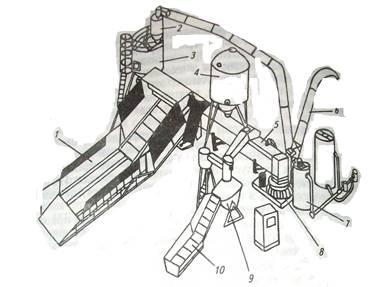 1 - питатель-дозатор ПДК-Ф-3-2; 2 - циклон; 3 - бункер-дозатор соломы; 4 - бункер концентрированных кормов; 5-сборный транспортер; 6 - пневмошвырялка; 7-оборудование для жидких обогатительных добавок; 8 - измельчитель-смеситель ИСК-ЗА; 9-измельчитель-камнеуловитель ИКМ-Ф-10; 10-приемный бункер корнеклубнеплодов.