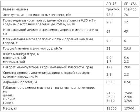 Валочно-трелевочная машина ЛП-17А - на базе трактора ТБ-1М на раме которого установлена поворотная колонна с манипулятором. На колонне расположены стрела и рукоять. На рукоять посредством подвески крепится ЗСУ. На раме трактора установлены коник и щит. Спереди трактора навешен толкатель.