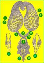 На рисунке: А - половые органы матки, Б - половые органы рабочей пчелы, В - половые органы пчелы - трутовки, 1 - яичники, 2 - парные яйцеводы, 3 - непарный яйцевод, 4 - семяприемник, 5 - половая щель, 6 - яйцевые трубочки, 7 - железа семяприемника.