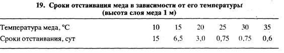 В зависимости от размера пчеловодческой фермы в производственном корпусе устанавливают одну-две радиальные медогонки с электроприводом или несколько других менее производительных медогонок. Для распечатывания меда применяют виброножи или паровые ножи. Поступающий из медогонки мед процеживают через фильтр и сливают в отстойники. Через несколько дней его разливают в тару (табл. 19). Чтобы мед в отстойник поступал самотеком, медогонку устанавливают выше отстойника.