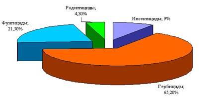 Наиболее широко в сельском хозяйстве России используются гербициды. Объясняется это тем, что сорняки среди вредных объектов вызывают наиболее существенные потери урожая. Кроме того, применение гербицидов освобождает хозяйство от малопроизводительного, изнурительного и неэстетичного труда на ручных прополках, позволяет осваивать прогрессивные энергоресурсосберегающие системы минимальной и нулевой обработок почвы. В меньших количествах используются фунгициды и инсектициды.