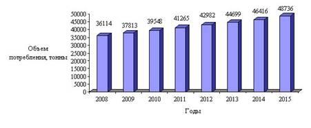 К 2015 г. прогнозируют, что объём потребления составит 48736 т. (http://www.agronews.ru/newsshow.php?NId=45518)