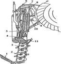 1 — полевой делитель; 2 — кронштейн; 3 — режущий аппарат; 4 — механизм уравновешивания; 5 — подрамник; 6 — стойка; 7 — гидрооборудование; 8 — рама навески; 9 — тяговый предохранитель; 10 - механизм привода; 11 — носок.