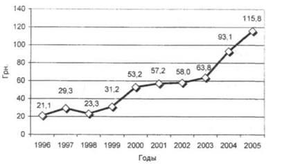 Учитывая структуру потребления нефтепродуктов сельскохозяйственными предприятиями Луганской области и средние цены реализации за последние 5 лет, следует отметить, что увеличение потребления нефтепродуктов в стоимостном выражении было вызвано ростом цен на них, а не потреблением в натуре. Так, в 2001 году средние цены на бензин А-95, А-92, А-80 и дизельное топливо составляли 1,88; 1,67; 1,44; 1,49 грн./л., а в 2005 году 3,52; 3,31; 2,95; 3,28 грнУл. соответственно. За период цены возросли в 1,87 -2,2 раза, а (рис.8).
