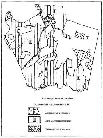В чем выражается деградация пастбищ, сенокосов в степной зоне? Это, прежде всего, уменьшение количества видов растений на единицу площади. На средне- и сильно деградированных участках оно снижается до 35—15 видов, причем среди них преобладают низкопитательные травы. Трава лишь частично покрывает поверхность земли (50—30%). Травяной покров сильно выбит скотом. Поэтому урожайность трав на таких пастбищах минимальна — 2—3 ц/га, в то время, как на хороших — 8—12 ц/га.