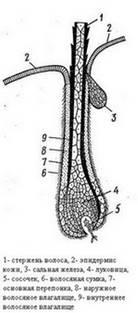 Все цвета волос (кроме белых) определяются одним пигментом - меланином. Различие цветов с различными оттенками обуславливается различной степенью окисления пигмента, а так же его толщиной, количеством, формой и размером гранул. Корень волоса заканчивается утолщением - луковицей, которая связана с кожей через волосяной сосочек. Луковица состоит из живых клеток, за счет которых происходит рост стержня волоса. Корень волоса лежит в волосяной сумке, образованной кожей, причем несколько наклонно, что обусловливает определенное направление роста волоса на шкурке. Очень важную роль для роста и развития волоса играют аминокислоты, содержащие серу (метионин, цистин и др.)