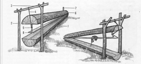 Оно служит порожком, а второе, более толстое и тяжелое бревно помещают над первым и используют как гнет. Бревна на концах укрепляют вбитыми по обоим сторонам колышками. При настораживании кулемки гнет приподнимают над «порожком» на 20 см. и торец его подхватывают сторожкам – деревянной палочкой толщиной в палец и длинной 12 см., которую за конец привязывают веревочкой к поперечной вязке крепежных кольев. Зверек, пролезая между бревнами сдвигает вниз насторожку, она освобождает сторожок, а в листе с ним и бревно, которое убивает его.