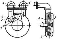 Рабочим органом вихревого насоса является рабочее колесо 1 с радиальными или наклонными лопатками (рис. 4), помещенное в цилиндрический корпус с малыми торцевыми зазорами. В боковых и периферийной стенках корпуса имеется концентричный канал 2, начинающийся у всасывающего отверстия и кончающийся у напорного. Канал прерывается перемычкой 4, служащей уплотнением между напорной и всасывающей полостями. Жидкость поступает через всасывающий патрубок 5 в канал, прогоняется по нему рабочим колесом и уходит в напорный патрубок 3.