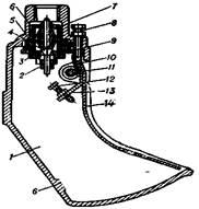 Рис. 12. Схема индивидуальной автопоилки для свиней:1 — поильная чаша; 2 — крышка клапана; 3 — седло клапана; 4 — клапан; 5 — прокладка уплотнительная; 6 — стакан; 7 — амортизатор; 8 — регулировочный болт нажимного рычага; 9 — планка прижимная; 10 — пружина; 11 — ось крышки поильной чаши; 12 — регулировочный болт хода клапана; 13 — нажимной рычаг; 14 — крышка поильной чаши.