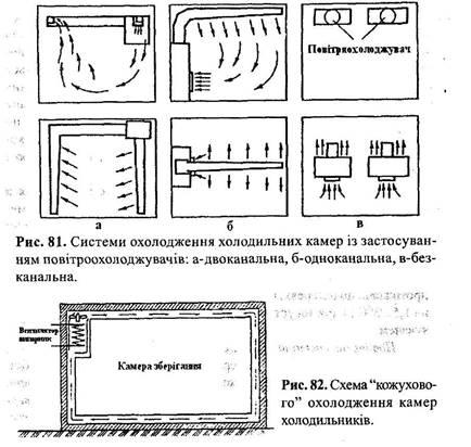 Повітряна система охолодження передбачає подачу в камери вже охолодженого повітря. Воно попередньо охолоджується за рахунок безпосереднього випаровування або холодним розсолом в апаратах повітро-і охолоджувачів. Повітроохолоджувачі можуть бути постаменты, вертикальні і горизонтальні, тобто встановлені на підлозі камери або підвищені, а також в коридорі або в окремому приміщенні.