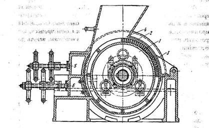 Рис. 156. Картоплетерочна машина: 1 - барабан, 2 - зубчасті пилки, З - стальні бруски, 4 - завантажувальний ківш, 5 - притискна колодка, 6 - нижня колодка.