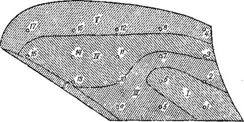 По интенсивности изнашивания полевую доску можшо разделить на четыре зоны: нижнюю часть, зону пятки,среднюю и переднюю часть (/–IV