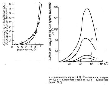Сухе зерно має невисоку інтенсивність дихання. За рік зберігання при температурі 10 - 20 'С 1 т сухого зерна (з вологістю до 14 %) втрачає за рахунок дихання 100 г (0,01 %) маси. У зерна середньої сухості (від 14,1 до 15,5 %) інтенсивність дихання приблизно в 1,5 - 2 рази вища, ніж у сухого. Вологе зерно (вологість 15,5 - 17%) різних культур різко збільшує інтенсивність дихання (кратне): пшениця - в 4 - 8, овес - в 2 - 5, кукурудза - в 8,5 - 17 в порівнянні із зерном середньої сухості. На мал. 3 показана залежність інтенсивності дихання від вологості зерна проса.