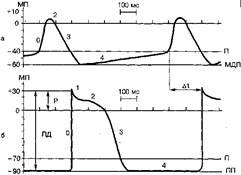 Потенцал действия в кардиомиоцитах формируется так же, как в других клетках возбудимых тканей, однако, имеются определенные отличия: