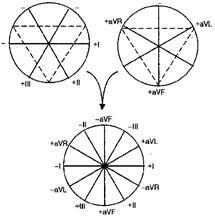 Направление осей отведений принято определять в градусах. За начало отсчета (0°) условно принимается радиус, проведенный строго горизонтально из электрического центра сердца влево по направлению к активному положительному полюсу I стандартного отведения. Положительный полюс II стандартного отведения расположен под углом +60°, отведения aVF — под углом +90°, III стандартного отведения — под углом +120°, aVL — под углом —30°, a aVR — под углом — 150°.