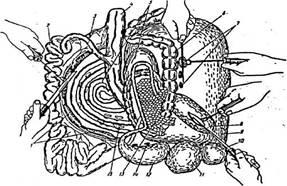 1 - брыжеечные лимфатические узлы, 2 — тощая кишка, 3 — подвздошная кишка, 4 — слепая кишка, 5 — ободочная и двенадцати перстная кишка, 6 — прямая кишка, 7—лимфатические узлы прямой кишки и рубца, 8 — селезенка, 9 — рубец, 10 — сетка, 11— книжка, 12 —сычуг, 13 — поджелудочная железа, 14—лимфатические узлы сычуга, 15 — лимфатические узлы ободочной кишки.