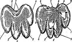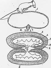 а—моментразрезапочекпобольшойкривизне, б—разрезаннаяпочкасобнаженнымизонами: