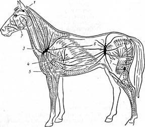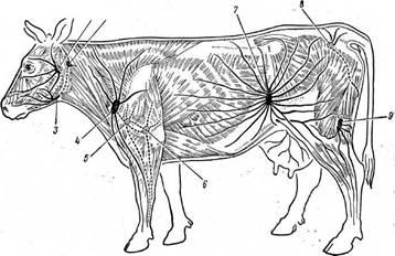 Поверхностные лимфатические узлы крупного рогатого скота (из Koch, 1965):1