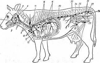 Глубокие лимфатические узлы крупного рогатого скота (из Koch, 1965):