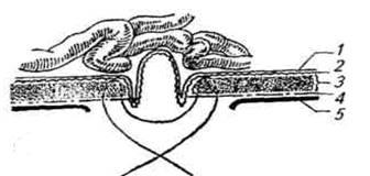 После вправления грыжевого содержимого в брюшную полость отпрепарованный грыжевой мешок перекручивают 2—3 раза вокруг продольной оси, прошивают кетгутом и вводят в грыжевое кольцо. Края грыжевого кольца сближают узловатыми швами из шелка по типу кишечного шва Ламбера. Для этого иглу вводят так, чтобы ее входное отверстие находилось на расстоянии 1—2 см от грыжевого кольца, а выходное — вблизи его края. Таким же путем, но в обратном порядке проводят иглу на противоположной стороне грыжевого кольца.
