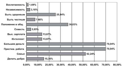 Как молодые представляют себе культурного человека? Это понятие включает в себя, прежде всего, образование, знание родного языка, истории своего народа и иностранных языков. В то же время в представлениях о культурном человеке у нашей молодёжи отсутствуют такие понятия как воспитанность, такт, честность и т.д. На сегодняшний день молодёжь Саратова считает более важным и ценным иметь престижную работу (70,04%), большие деньги (70,04%), семью (52,24%), занимать высокое положение в обществе (36,83%), быть здоровым (25,84%). Менее значимы для молодых людей ценности следующего порядка: делать добро людям (15,36%), быть интеллектуально развитым (13,67%), получать высокую зарплату (13,67%), быть независимым (10,86%), честным (7,68%), поступать по совести (3,93%), быть воспитанным (3,18%). (Диаграмма 2).