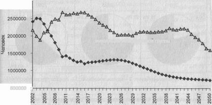 Наиболее вероятным является прогнозный вариант, согласно которому численность населения России будет неуклонно сокращаться и достигнет к началу 2050 г. 90590.6 тыс. человек, уменьшившись по сравнению с началом 2001 г. на 54.2 млн., или в 1.6 раза. Доля населения 60 лет и старше увеличится с 18.9% до 38.5%, доля населения трудоспособного возраста упадет с 18.6% до 9.4%. При этом более интенсивно число жителей будет убывать во второй половине прогнозируемого периода. Так, если к началу 2025 г. число россиян по данному прогнозному варианту сократится на 20,2 млн. или в 1,16 раза по сравнению с началом 2001 г., то за период 2025-2049 гг. (т.е. к началу 2050 г.) численность населения уменьшится на 34,0 млн. или почти в 1,4 раза. Ежегодная убыль населения достигнет минимума в 2008 г., а затем начнет быстро нарастать и превысит 1 млн. в 2020 г., 1 млн. 200 тыс. - в 2026 г., 1 млн. 400 тыс.-в 2041г.