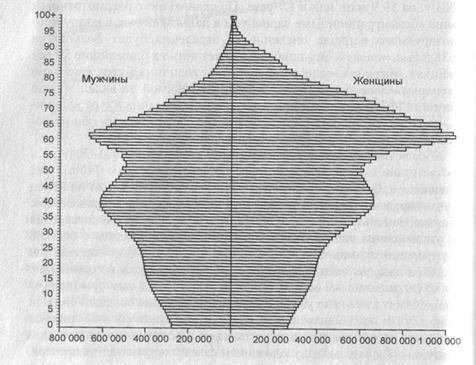 Половозрастная пирамида населения России на начало 2050 г. при условии сохранения режима воспроизводства населения на уровне 2000 г. и ежегодного 1,5%-ного сокращения абсолютных половозрастных показателей миграционного прироста