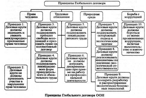 Самым важным из перечисленных кодексов является Глобальный договор ООН - добровольная инициатива, начало которой было положено в январе 1999 г.; она призывает бизнес-структуры помогать в налаживании сотрудничества в социальной сфере и сфере защиты природной среды с целью обеспечения равного доступа всех людей к преимуществам и достижениям глобальной экономики. Сегодня существует более 2400 компаний, ставших участниками Глобального договора, и 47 его национальных сетей. Он основан на 10 универсальных принципах, которые нужно рассматривать и с локальной, и с глобальной точек зрения (см. рисунок). Сети Глобального договора ООН могут организовываться по географическому (страна, регион) или по отраслевому принципу.