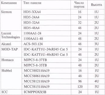 Большинство производителей панелей рассматриваемого класса выпускают их в двух вариантах, с разводкой 568А и 568В. При монтаже панели рекомендуется пользоваться схемой Т568В подключения горизонтальных кабелей к модульным розеткам. Общие сведения о таких панелях некоторых изготовителей оборудования для СКС приводятся в табл. 1.