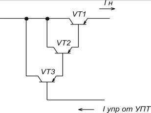 В тех случаях, когда имеющиеся в распоряжении силовые трансформаторы не обеспечивают необходимый ток нагрузки Iн, применяется параллельное включение нескольких транзисторов (рисунок 7).