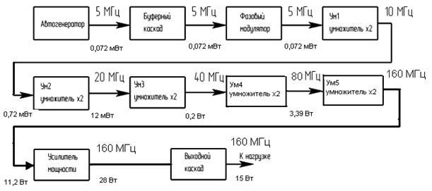 Кварцевые генераторы могут иметь выходную мощность до 10 мВт, отсюда следует вывод о том, что коэффициента усиления умножителей частоты достаточно и дополнительного усилителя мощности не требуется. На рис.3 приведена окончательная структурная схема передатчика.