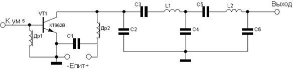 Мощность на выходе умножителя частоты ум1 должна быть: Рум1=Рум2/Крум2=0,012/16,66=0,00072 Вт, а максимальная частота работы ум1 составляет -10 МГц.
