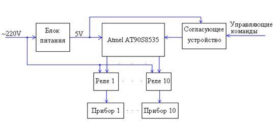 Блок коммутационных реле осуществляет сообщение портов МК и подключенных к нему электроприборов с целью обеспечить при необходимости подачу на прибор питания 220 В, 50 Гц.