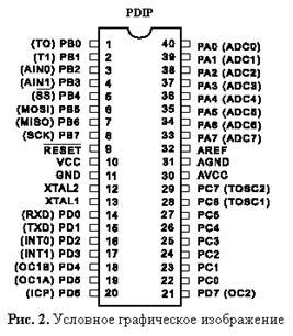 Основным узлом данного устройства является микроконтроллер AT90S8535 фирмы Atmel. Графическое обозначение микроконтроллера приведено на рис 2. AT90S8535 является маломощным, высокопроизводительным 8-ми разрядным микроконтроллером, изготовленным по технологии КМОП на основе AVRRISC архитектуры. МК спроектирован по новейшей технологии Atmel с высокой плотностью интеграции, а также удобной системой команд и набором выводов. В состав однокристального МК
