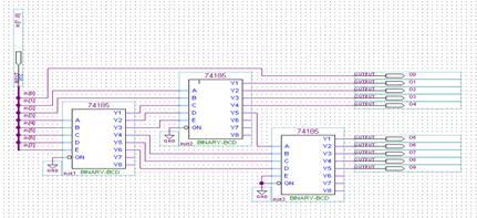Рис. 7. Схема преобразователя двоичного кода от 0 до 255 в двоично-десятичный код, подготовленная для загрузки на стенд.