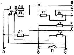 Отмотать от резистора R2, включенного в линию провода А, часть проволоки с сопротивлением, равным сопротивлению провода А, а от резистора R9, включенного в линию провода С, часть проволоки с сопротивлением, равным сопротивлению провода С. указанные измерения сопротивления и подгонку их производят с максимальной точностью до тысячных долей Ома.