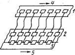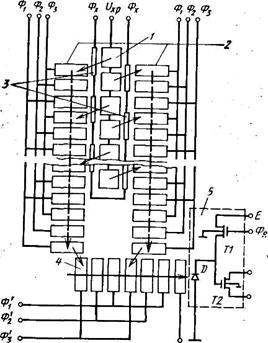 1 - электроды светочувствительной области; 2 - передающие электроды: 3 - связывающие электроды; 4 - двухразрядный сдвиговый регистр; 5 – выходная