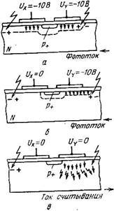 - режим накопления зарядового пакета; б - перенос зарядов под У-шину; в- инжекция зарядов в подложку при считывании