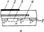 Рис.21. Структура (а) и эквивалентная схема (б) усилителя с плавающим затвором: 1 - тактовый электрод; 2 - плавающий затвор; 3 - потенциальная яма ПЗС; 4 - канал МДП-транзистора; 5 - каналоограничивающие