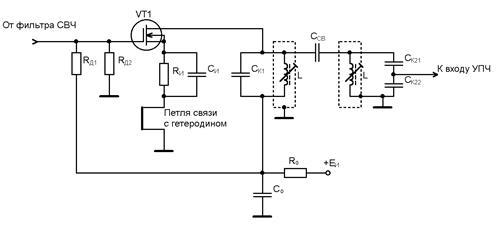 Преобразователю зачастую предшествует малошумящий усилитель высокой частоты. Применение малошумящего усилителя перед преобразователем позволяет увеличить отношение сигнал/шум. Связано это с тем, что даже при применении в усилителе и в преобразователе малошумящих усилительных элементов шумы преобразователя превышают шумы усилителя в 3…5 раз [2]. Решение, о применении или нет усилителя радиочастоты, будет принято ниже после эскизного расчёта шумовых свойств узлов приёмника.