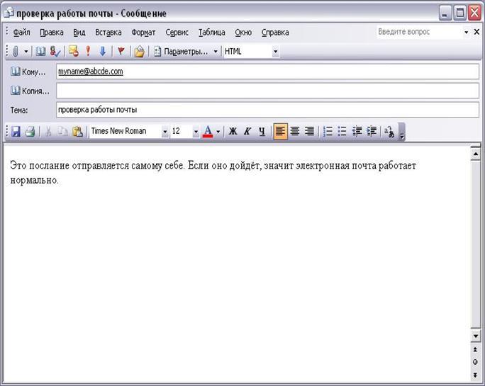 В поле Тема вводится краткое описание вопроса, которой посвящено сообщение. После того как тема указана, соответствующий текст становится заголовком окна. В поле Кому вводится адрес основного получателя письма, в поле Копия адрес получателей копии. Если необходимо отправить копию письма, о котором ничего не известно другим адресатам, соответствующий адрес вводится в поле Скрытая (если такое поле отсутствует, надо дать команду Вид-Все заголовки).