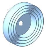 Боковой диск, на котором крепятся кольца, имеет внешний радиус 60мм внутренний 7,5мм (как у DVD диска) толщину 2,5мм. Сбоку прикреплены 4 кольца толщиной 1,2 мм (как у DVD диска) с двумя рабочими поверхностями – внутренней и внешней. Шаг между внешними радиусами (и соответственно внутренними) составляет 8мм. Расчетная масса 72 г. Момент инерции 1570 г*см^2.