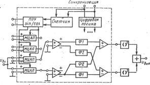 Устройства на ППЗ позволяют осуществлять преобразование Фурье, которое используется в анализаторах спектра, схемах обнаружения сигнала, частотных фильтрах и т. п. Для этого применяется алгоритм, основанный на согласованной фильтрации сигнала, предварительно гетеродинированного с помощью ЛЧМ колебания. В ИС входят четыре ЦАП, выполняющих роль перемножителей входного и опорного сигналов (МЦАП), сумматоры на ОУ, четыре ПЗС фильтра Ф1 и Ф2, согласованных с квадратурными составляющими сигнала (рис.15). Число коэффициентов в фильтрах — 32, максимальная тактовая частота 1 МГц. Особенностью устройства является хранение квадратурных составляющих ЛЧМ опорного сигнала в цифровой форме в памяти микросхемы, откуда они подаются на МЦАП. Для вычисления составляющих спектра входного сигнала добавлены внешние сумматор и квадраторы. Входящие в ИС два дополнительных МЦАП позволяют организовать обработку комплексного входного сигнала или восстановление на выходе частоты спектральных компонент входного сигнала.Возможность внешнего программирования фильтров на ПЗС позволяет создавать на основе этих фильтров адаптивные компенсаторы помех. Адаптивный компенсатор помех является оптимальным фильтром, минимизирующим среднеквадратическую погрешность в воспроизведении сигнала и обладающим возможностью адаптации к сигналу и помехе. Компенсаторы помех применяются при передаче речевого сигнала, фильтрации узкополосного сигнала на фоне широкополосной помехи и т. п., где есть возможность принять сигнал помехи отдельно от полезного сигнала.