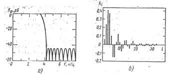 Рис. 12. Амплитудно-частотная характеристика 32-коэффициентного ФНЧ (а) и соответствующая импульсная характеристика (б)