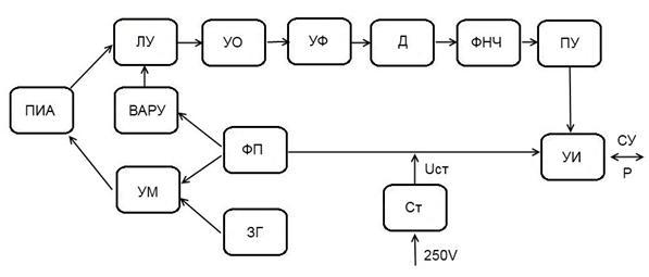 ЗГ - Задающий генератор, ФП - формирователь посылки, УМ - Усилитель мощности, ПИА – приемно-излучающая антенна, ЛУ – линейный усилитель, УО – усилитель ограничитель, УФ – усилитель фильтр, Д – детектор, ФНЧ – фильтр низкой частоты, ПУ – пороговое устройство, УИ – устройство измерения дистанции, ВАРУ – система временной автоматической регулировки усиления, СТ – стабилизатор, СУ – система управления, Р – регистратор.