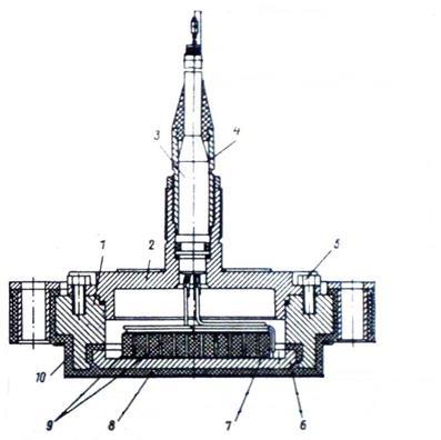 Блок пьезоэлементов состоит из мембраны 6, завулканизированной в корпус. На мембране наклеены пьезоэлементы 7. В корпусе имеются отверстия, в которые устанавливаются металлические втулки для крепления антенны на судне. С целью обеспечения акустической развязки антенны от вибрации корпуса судна и изоляции мембраны от внешней среды корпус и блок пьезоэлементов завулканизированы резиной. Для предохранения излучающей поверхности антенны от повреждений при транспортировке и хранении предусмотрен защитный щиток 8, который снимается после установки антенны на судно.